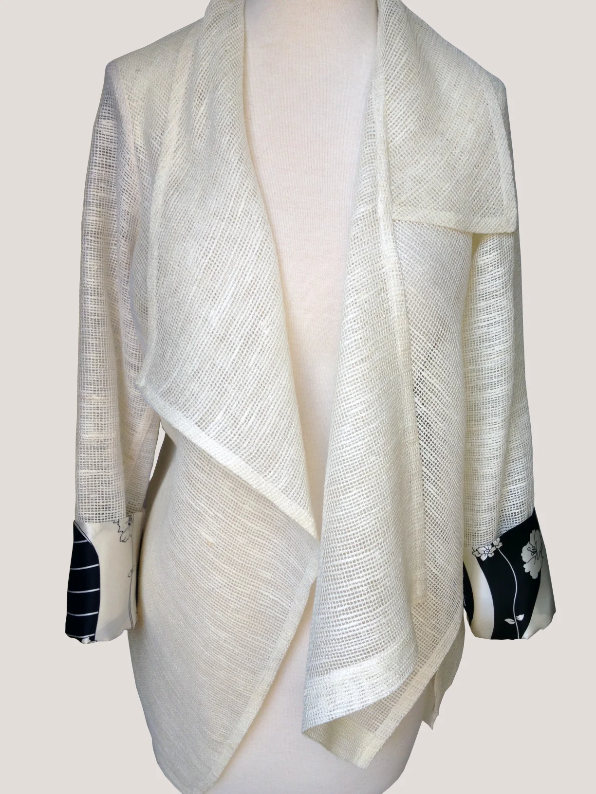Asymmetrical Jacket Off White Silk Burlap with Black/White Silk Charmeuse